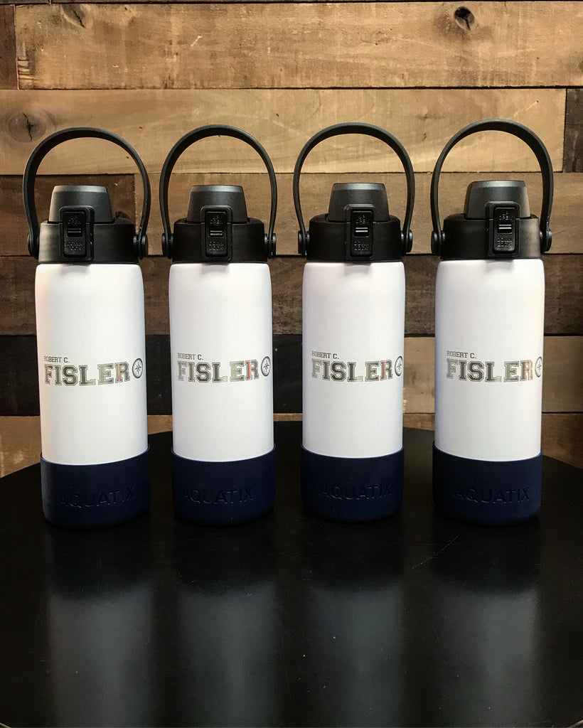 This listing is for an engraved 21 ounce Aquatix Insulated Bottle engraved on front with the "Robert C. Fisler" logo with a Navy Blue Protective Sleeve.
