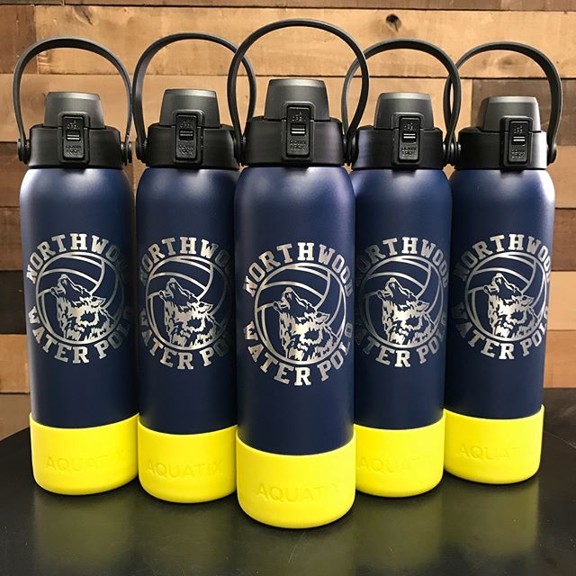 This listing is for an engraved 32 ounce Navy Blue Aquatix Insulated Bottle engraved on front with the "Northwood Water Polo" logo with a Yellow Protective Sleeve.